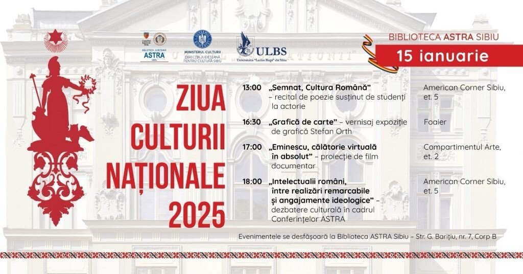 Ziua Culturii Naționale va fi celebrată la Biblioteca Județeană ASTRA Sibiu printr-o serie de evenimente și activități derulate pe parcursul zilei de 15 ianuarie 2025.