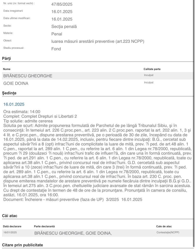 Pentru presupusele fapte de corupție, cei doi angajați au fost deja reținuți pentru 24 de ore, procurorii sibieni cerând în cursul zilei de astăzi, arestarea lor preventivă. În urmă cu puțin timp, judecătorii au decis că dovezile sunt suficiente pentru admiterea cererii de arestare preventivă pentru 30 de zile.