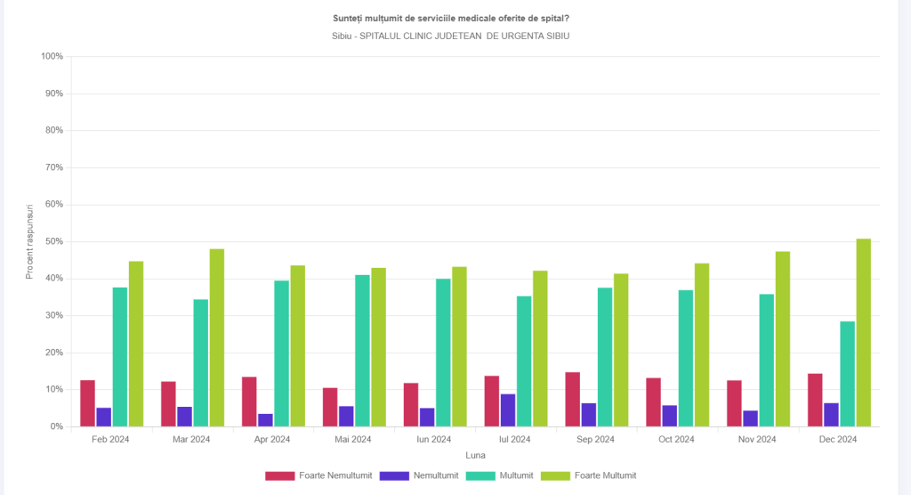 Separat, pacienții foarte mulțumiți de serviciile medicale primite la Spitalul Județean Sibiu au fost procentual între 41% și 51%, cu cea mai mare cotă atinsă în decembrie 2024. Cei mulțumiți au variat între 29% și 41%, cu cea mai mare cotă în luna mai și cea mai mică în luna decembrie.