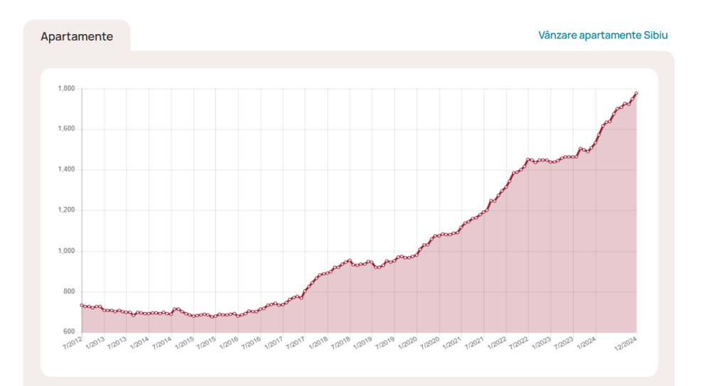 O analiză a siteului imobiliare.ro arată evoluția prețurilor pe metru pătrat la apartamente în Sibiu. Dacă în 2012 acestea se vindeau în medie cu prețul de 700 de euro/mp, la finele anului trecut au ajuns la o medie de 1.777 de euro pe metru pătrat.
