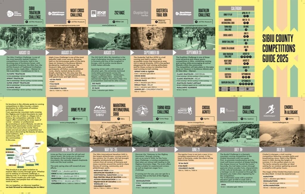 Această broșură este ghidul complet al competițiilor de alergare din județul Sibiu, o destinație de vis pentru iubitorii de mișcare și natură. De la trasee montane spectaculoase care străbat Munții Făgăraș și Cindrel, până la curse de șosea în orașul Sibiu sau în satele pitorești, calendarul competițional din această regiune oferă ceva pentru fiecare tip de alergător – amator sau profesionist.