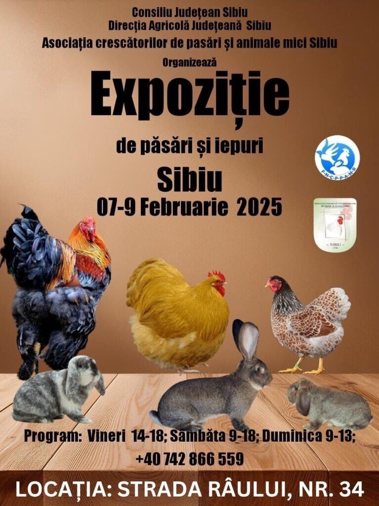 Asociația Județeană a Crescătorilor de Păsări și Animale Mici, cu sprijinul CONSILIULUI JUDEȚEAN SIBIU și a DIRECȚIEI AGRICOLE JUDEȚENE SIBIU, organizează a 28-a ediție a Expoziției anuale județene de “PĂSĂRI ȘI ANIMALE MICI” în rasă pură, în perioada 7-9 FEBRUARIE 2025, locația strada Râului ,nr. 34.