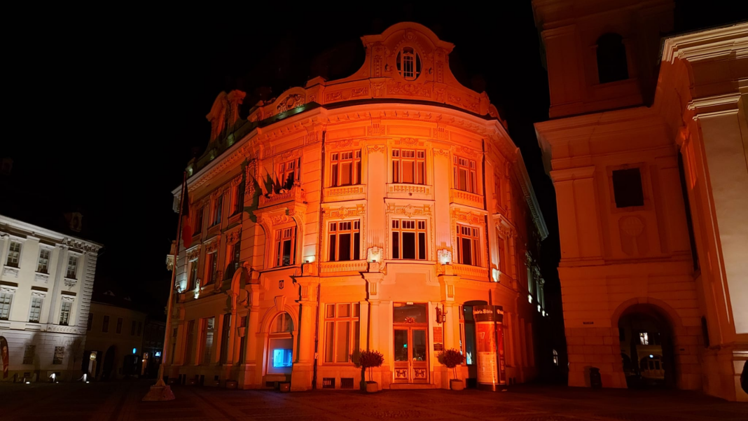 Ieri, sediul Primăriei Sibiu a fost iluminat în portocaliu, un gest simbolic făcut pentru a susține campania Ziua Mondială de Luptă Împotriva Cancerului, marcată anual pe 4 februarie.