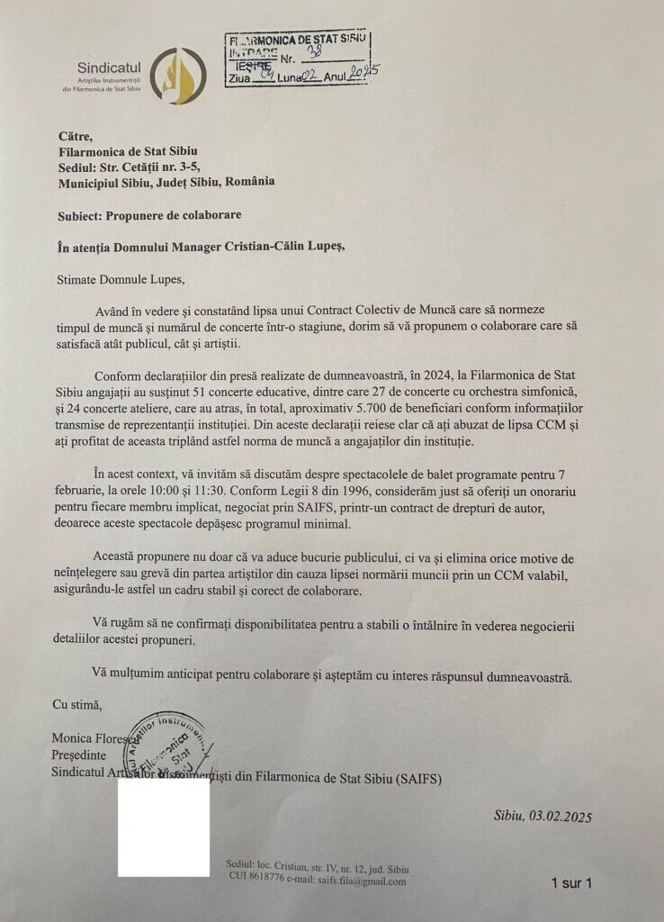 Scandalul de la Filarmonica de Stat Sibiu continuă. De data aceasta, un nou concert educativ pentru copii, din 7 februarie, este boicotat de sindicaliștii conduși de Monica Florescu (soția instrumentistului ruso-cubanez concediat). Aceștia cer bani în plus pe legea drepturilor de autor pentru a participa la concert. Deși sunt plătiți lunar cu sume cuprinse între 6.000 și 17.000 de lei, sindicaliștii spun că aceste concerte educative depășește norma minimă de concerte. Consiliul Județean Sibiu plătește 850.000 de lei lunar pentru salariile celor din filarmonică. Chiar dacă sunt în multiple greve.