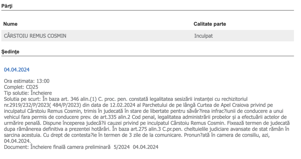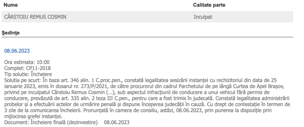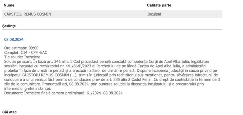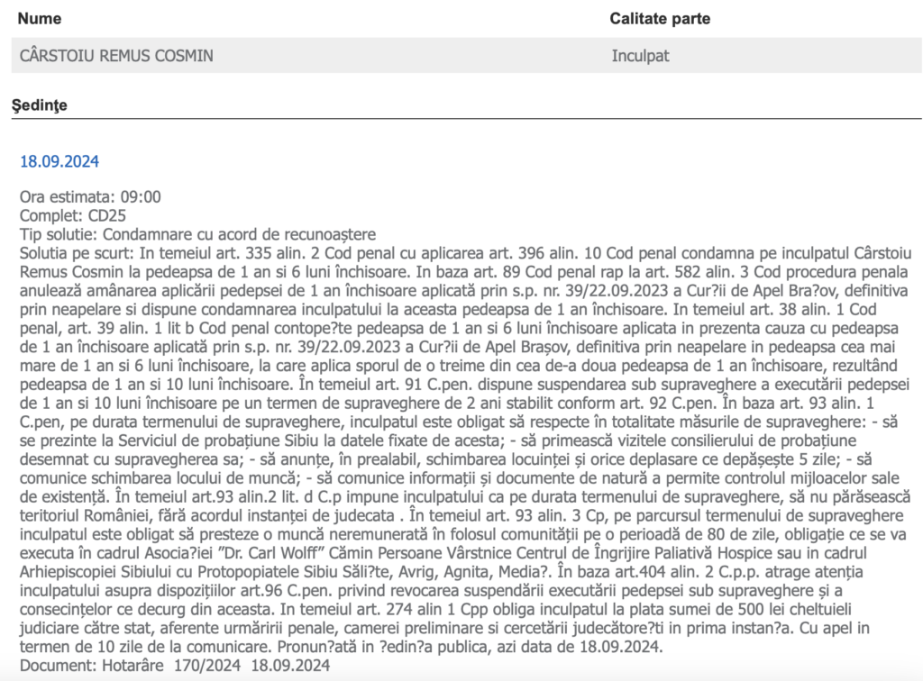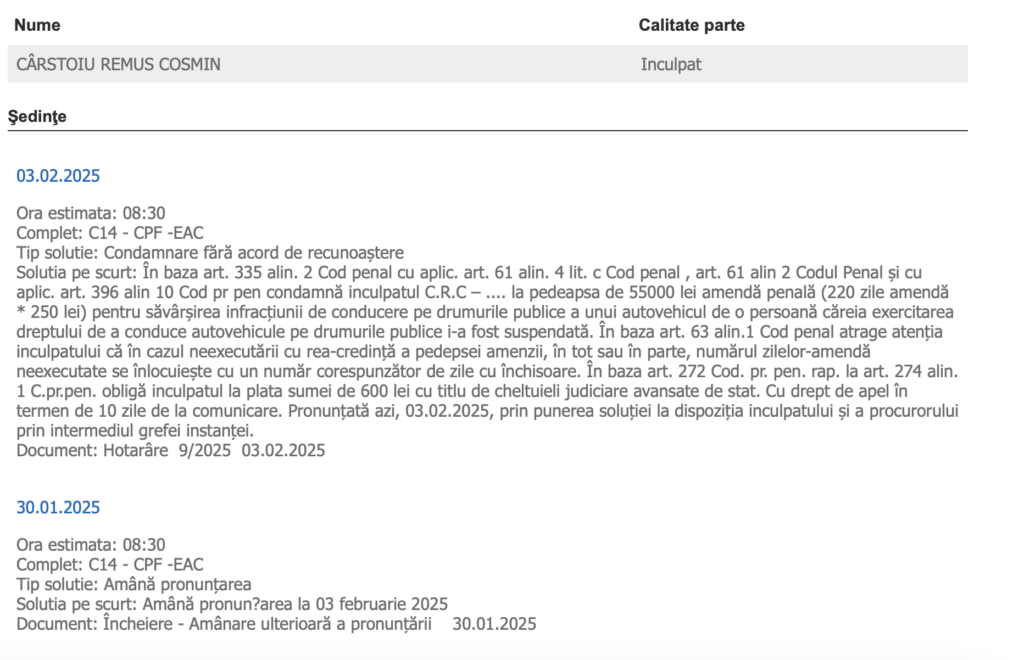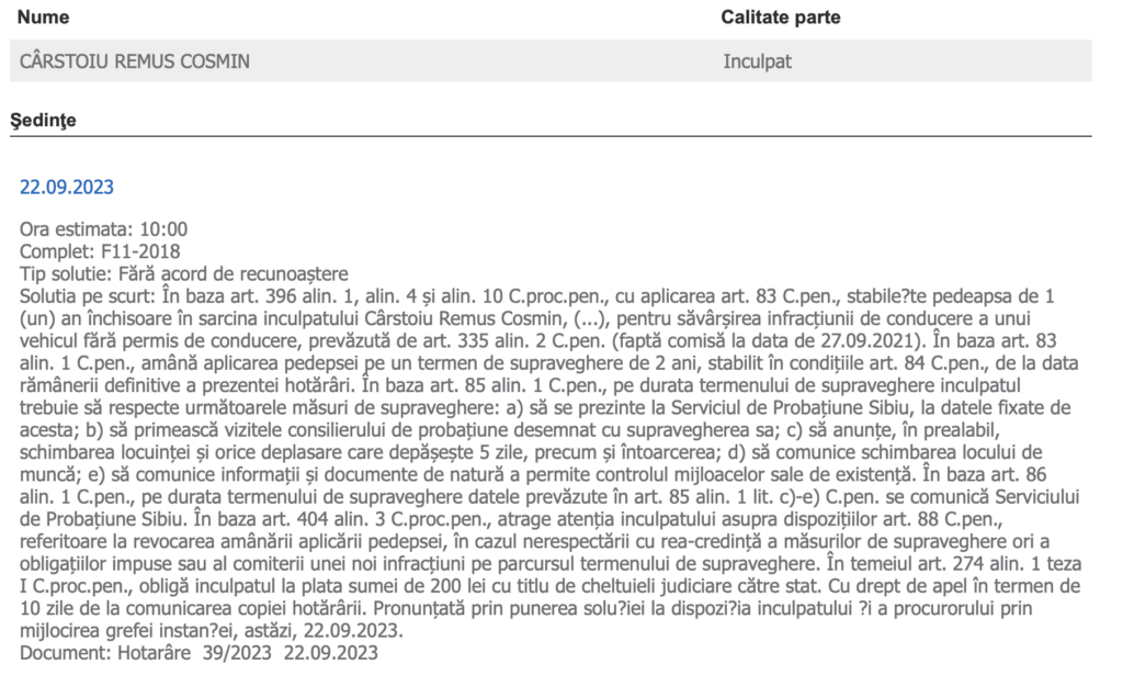 Sentința a fost pronunțată în data de 03.02.2025, cu termen de apel în 10 zile. Însă cel mai probabil, procurorii nu vor face nici aici apel. Conform surselor Sibiu Independent, denunțuri ar mai fi fost realizate și de alți polițiști sibieni, tot pentru că aceștia, aflați în timpul liber, l-au zărit în trafic. Însă fără nici un rezultat!