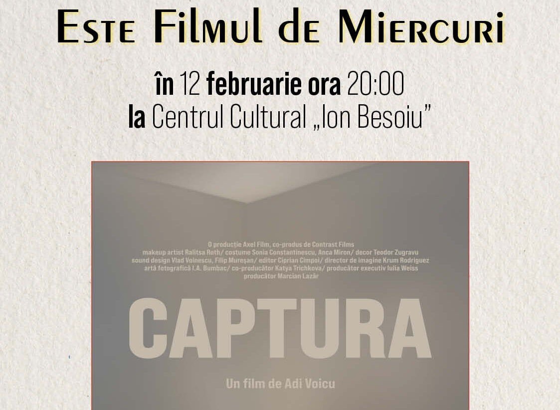 ESTE Filmul de Miercuri prezintă filmul „Captura”, un film românesc despre abuzul de putere în diferitele sale forme, reprezentând debutul în lungmetraj al regizorului Adi Voicu. Proiecția va avea loc miercuri, 12 februarie, de la ora 20.00, la Sala Mică a Centrului Cultural ”Ion Besoiu” din Sibiu.