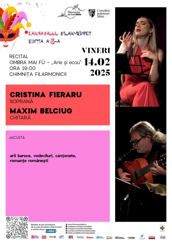 Iubirea este sărbătorită, vineri, 14 februarie, tot de la ora 19.00, cu soprana Cristina Fieraru și chitaristul Maxim Belciug. Recitalul „Arie și Ecou” va încânta publicul cu arii, vodeviluri, canţonete și romanţe – un program ca un templu, care adună în el unele dintre cele mai prețioase odoare ale barocului liric și alte nestemate eclectice din universul canto-ului clasic. La cererea publicului, recitalul va avea loc în sala mare, iar numărul biletelor puse în vânzare la casierie și online a fost suplimentat.