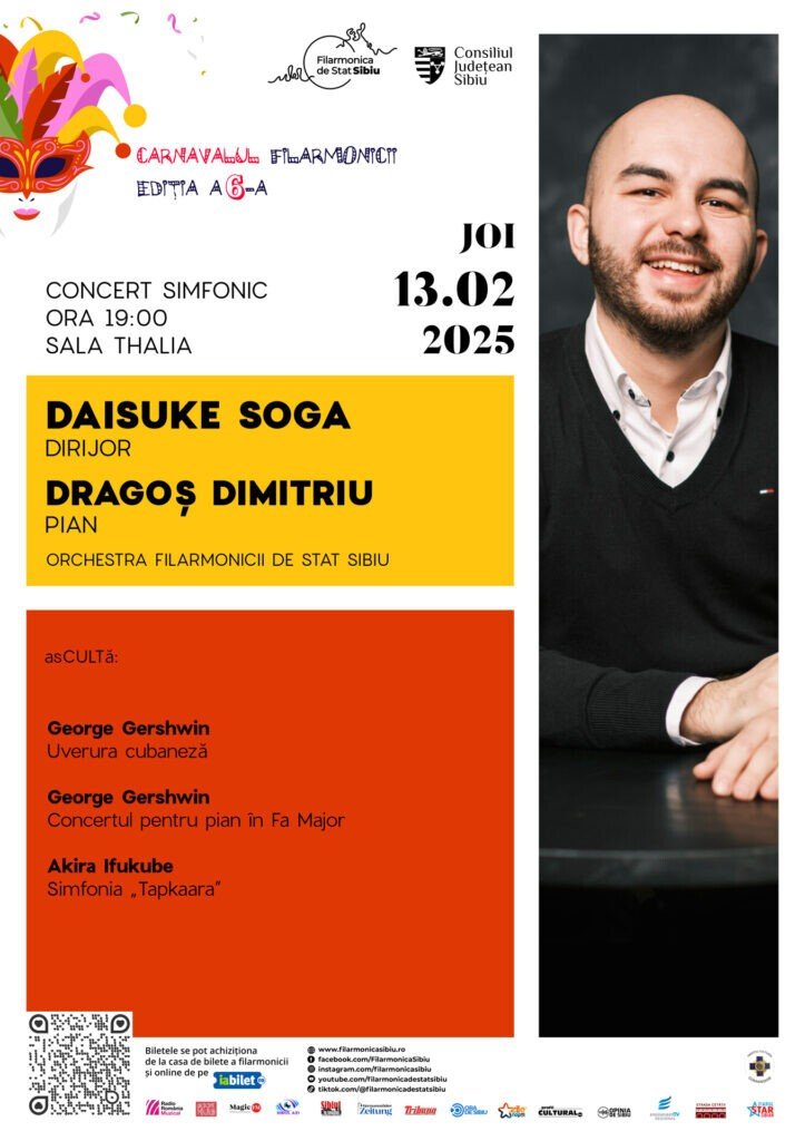 Concertul simfonic de joi, 13 februarie, ora 19.00, va purta publicul într-o călătorie muzicală pe mapamond, cu armonii exuberante și ritmuri exotice, de la Sala Thalia până în Cuba la New York și apoi în Japonia, sub conducerea dirijorului Daisuke Soga. Solisul serii va fi pianistul Dragoș Dimitriu. Biletele se găsesc la casieria Filarmonicii și pe iabilet.ro, la prețul de 60 lei (50% reducere pentru elevi, studenți, pensionari).