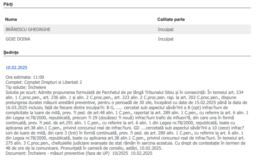 Pentru presupusele fapte de corupție, în 16 ianuarie 2025, cei doi angajați au fost reținuți pentru 30 de zile. Acum 3 zile, judecătorii au decis să le prelungească mandatul de reținere cu încă 30 de zile.