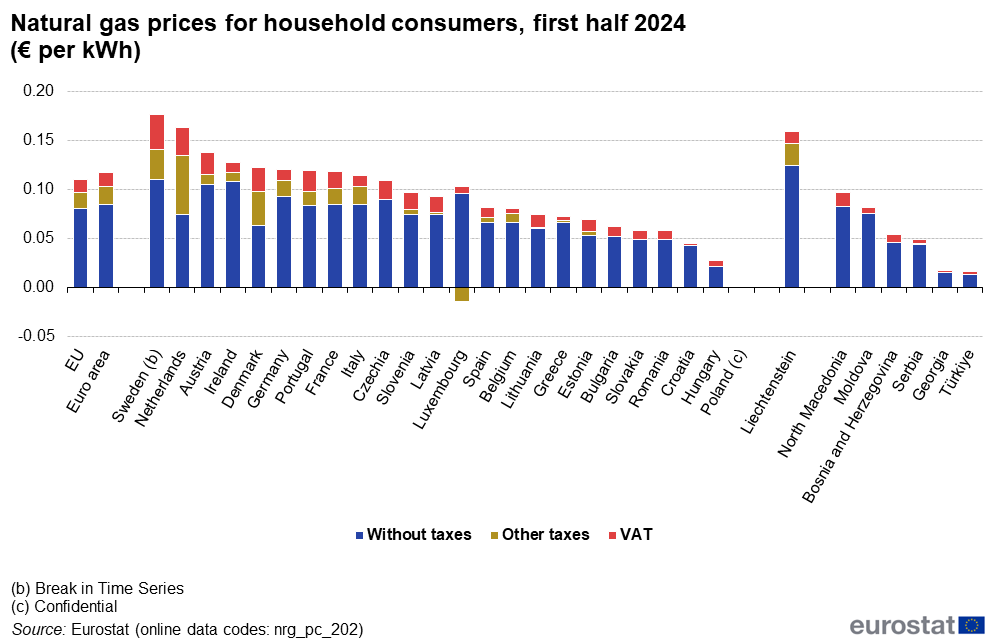O analiză tip fact-check (verificare informații) făcută de SIBIU INDEPENDENT relevă că pe piața de informații, la ora actuală, singurul raport privind prețul gazelor plătit de populație este cel oferit de EUROSTAT. Pe siteul instituție este prezentat raportul pe primul semestru al anului 2024. Conform tabelului (mai jos), populația României plătește unul din cele mai mici prețuri la gaz, de trei ori mai mic ca locuitorii din Suedia.