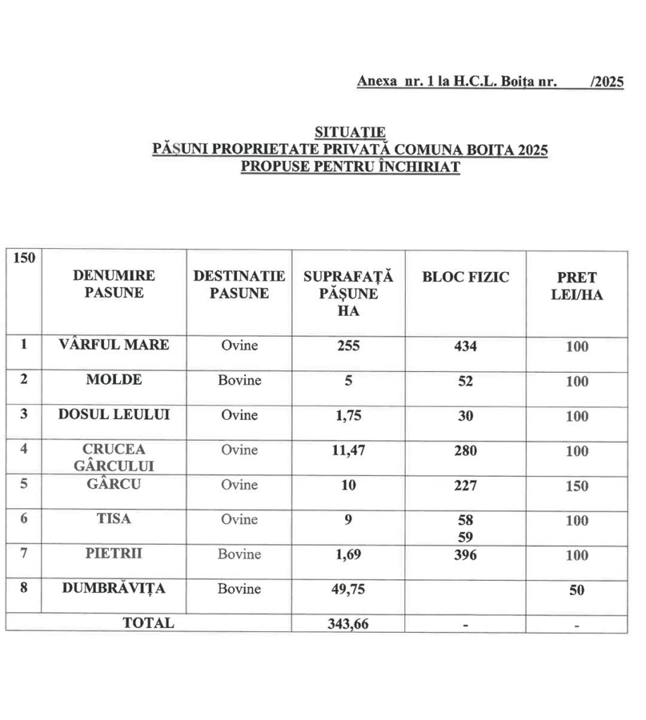 Primăria Comunei Boița anunță scoaterea spre închiriere a unor terenuri – pajiști comunale, situate în extravilanul localității, destinate pășunatului bovinelor și ovinelor. Procedura se desfășoară conform OUG 34/2013, privind organizarea, administrarea și exploatarea pajiștilor permanente.