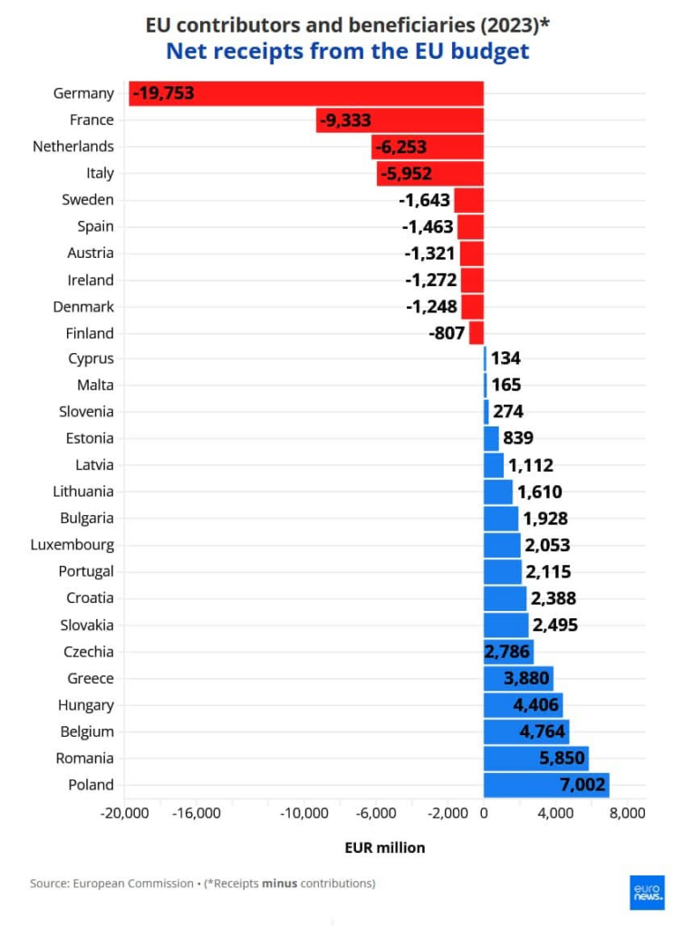 Conform ultimelor date financiare, 17 state membre UE au primit mai mulți bani decât au contribuit, iar România este pe locul 2, primind fonduri în valoare mult mai mare decât a contribuit. Astfel, țara noastră a plătit contribuții de 2,8 miliarde de euro și a primit fonduri de 8,65 miliarde de euro.