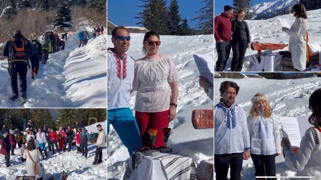 Ieri, cu o zi înainte de Dragobete, după 4 ore de urcat pe jos prin omăt, au fost întâmpinați de Nicoleta Ocneri, ghid, dar și „ofițerul de stare civilă”. Acolo, Claudiu și Alina, cu o relație de doar 7 luni, dar cu o iubire de basm, au hotărât să fie primii care se căsătoresc pentru o zi, într-un loc magic, la o altitudine de 1450 de metri, chiar în Munții Făgăraș.