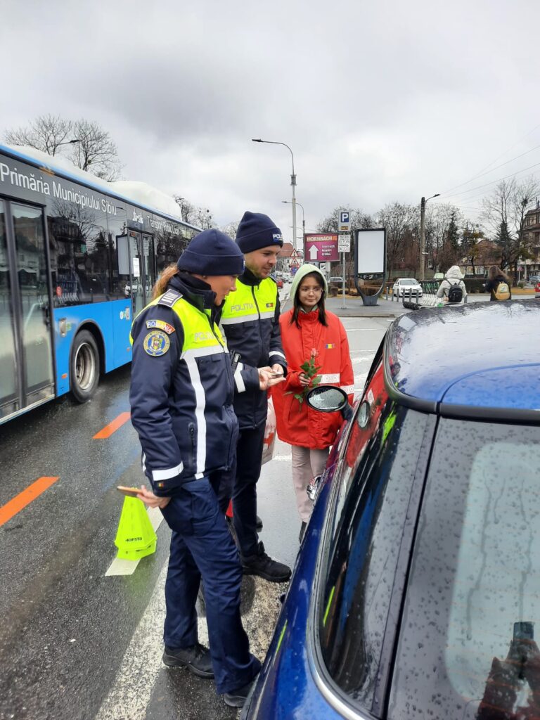 Polițiștii rutieri din Sibiu, alături de reprezentanții Registrului Auto Român și voluntarii Crucii Roșii Sibiu, au întâmpinat prima zi de primăvară cu o acțiune specială dedicată doamnelor și domnișoarelor aflate în trafic. Participantele au fost „sancționate” simbolic cu mărțișoare și sfaturi pentru siguranța rutieră.