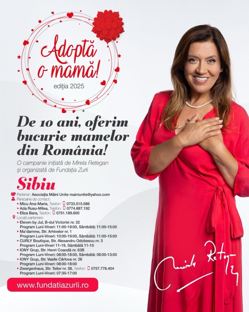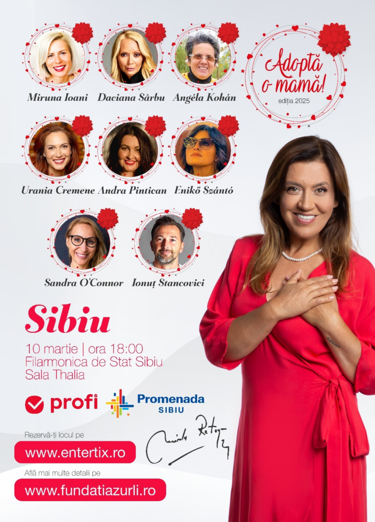 Mirela Retegan și Fundația Zurli ajung în 10 orașe cu un mesaj puternic de inspirație și susținere pentru femei. Evenimentul va avea loc luni, 10 martie, ora 18:00, la Filarmonica de Stat Sibiu – Sala Thalia