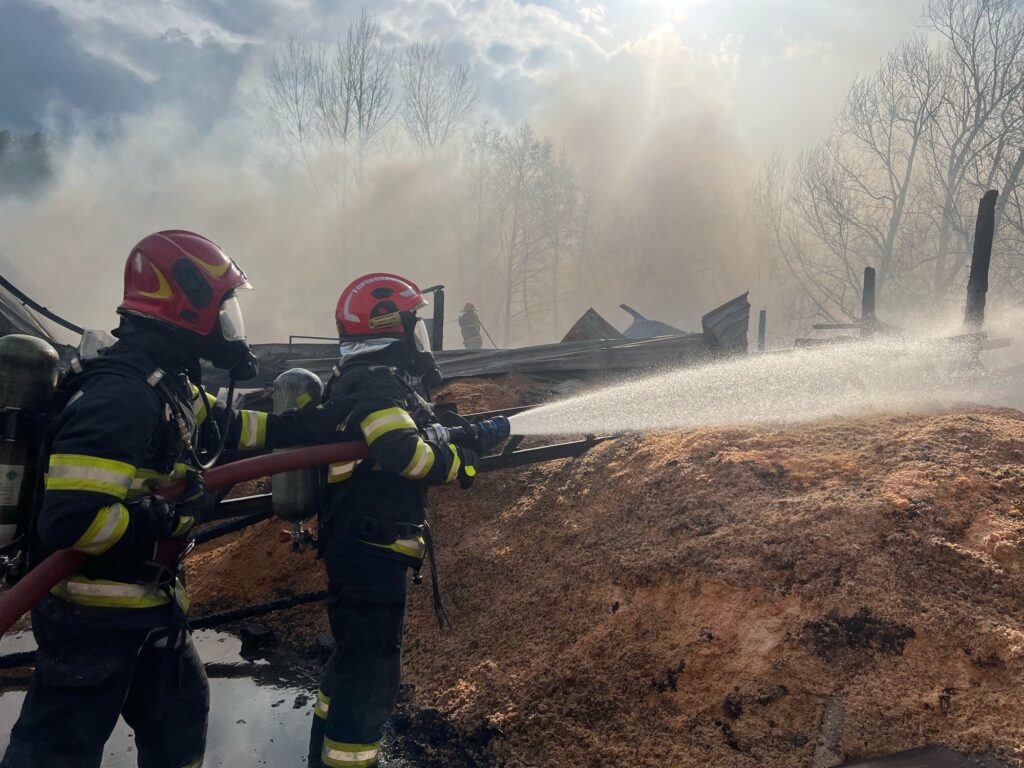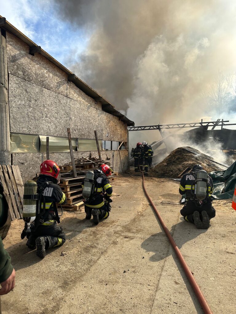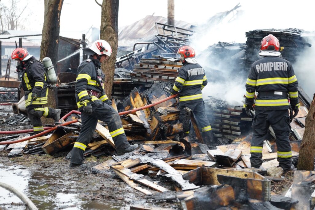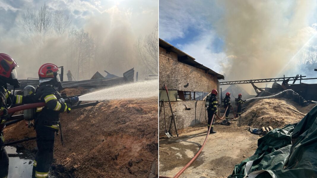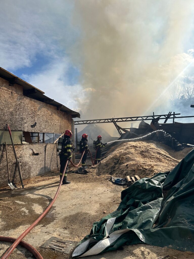 ACTUALIZARE ora 19:00 – Incendiul a fost lichidat. Pompierii au salvat o hală și alte bunuri depozitate în apropierea incendiului. Cu toate aceste, flăcările au distrus în totalitate o anexă de aproximativ 200 de mp în interiorul căreia se aflau două utilaje de prelucrare a lemnului și de presare a rumegușului. De asemenea, au ars aproximativ 30 de tone de rumeguș și 100 de paleți. Cauza probabilă de izbucnire a incendiului a fost un scurtcircuit produs la un cablu electric defect și neizolat corespunzător.Din fericire nu au fost victime.