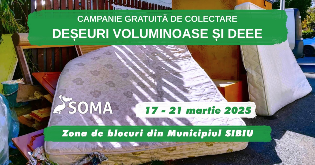 Operatorul de salubritate SOMA Sibiu a anunțat lansarea unei campanii gratuite de colectare a deșeurilor voluminoase și DEEE (deșeuri electrice și electronice) pentru locuitorii de la bloc, desfășurată în perioada 17 – 21 martie 2025.