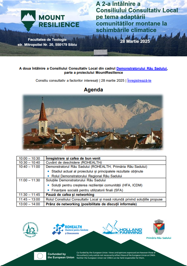 În data de 28 martie la Universitatea Lucian Blaga din Sibiu va avea loc cel de-al doilea Consiliu Consultativ Local asupra adaptării climatice a comunității montane din Munții Cindrel. Evenimentul este organizat de demonstratorul regional Râu Sadului din cadrul proiectului MountResilience în contextul amenințării coeziunii socio-economice și a biodiversității la care sunt supuse zonele montane europene din cauza schimbărilor climatice. Sunt invitați să participe la întâlnire fermierii, reprezentanții organizațiilor de fermieri, precum și toți factorii interesați din domeniul agricol și al zootehniei (reprezentanți locali, întreprinderi, asociații, cooperative, etc).