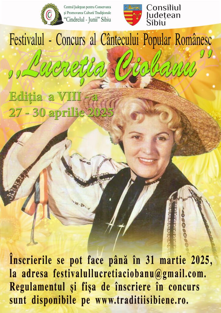 Până în data de 31 MARTIE 2025, tinerii interpreți de muzică populară din România şi diaspora se pot înscrie la preselecția Festivalului-Concurs al Cântecului Popular Românesc „Lucreţia Ciobanu” 2025, organizat de Centrul Județean pentru Conservarea şi Promovarea Culturii Tradiționale „Cindrelul – Junii” Sibiu.