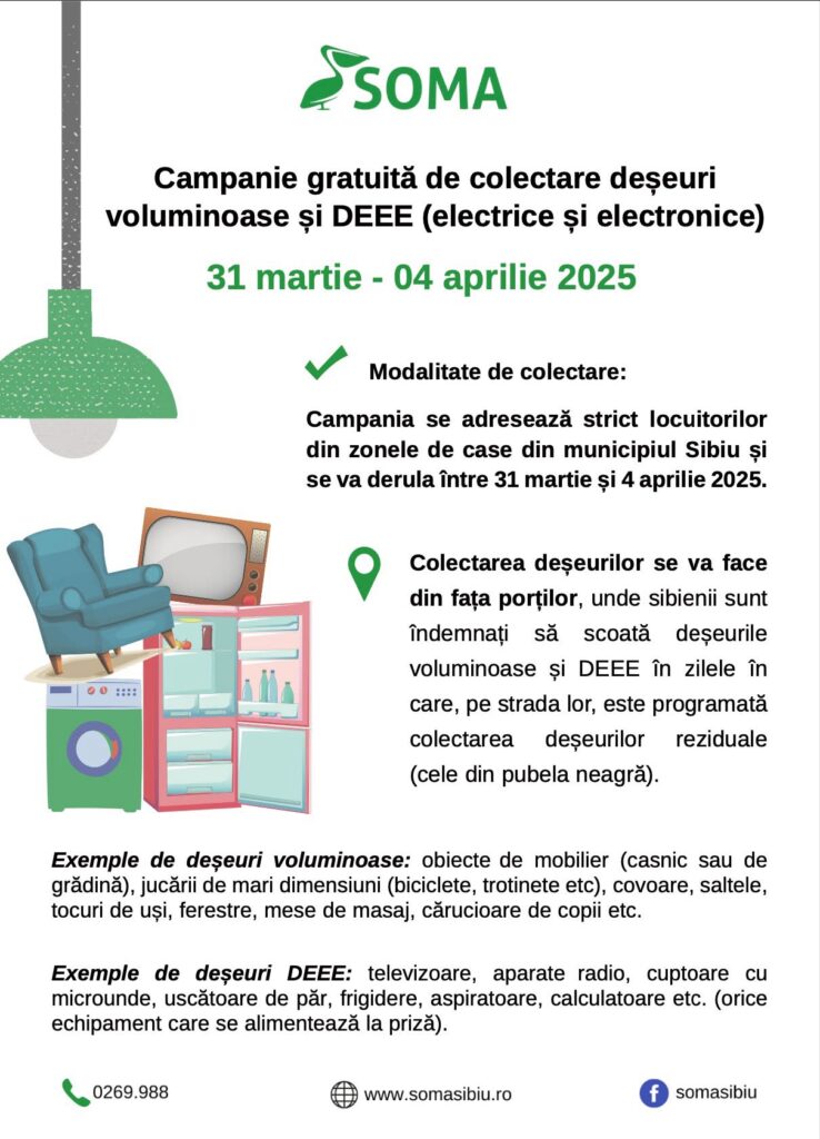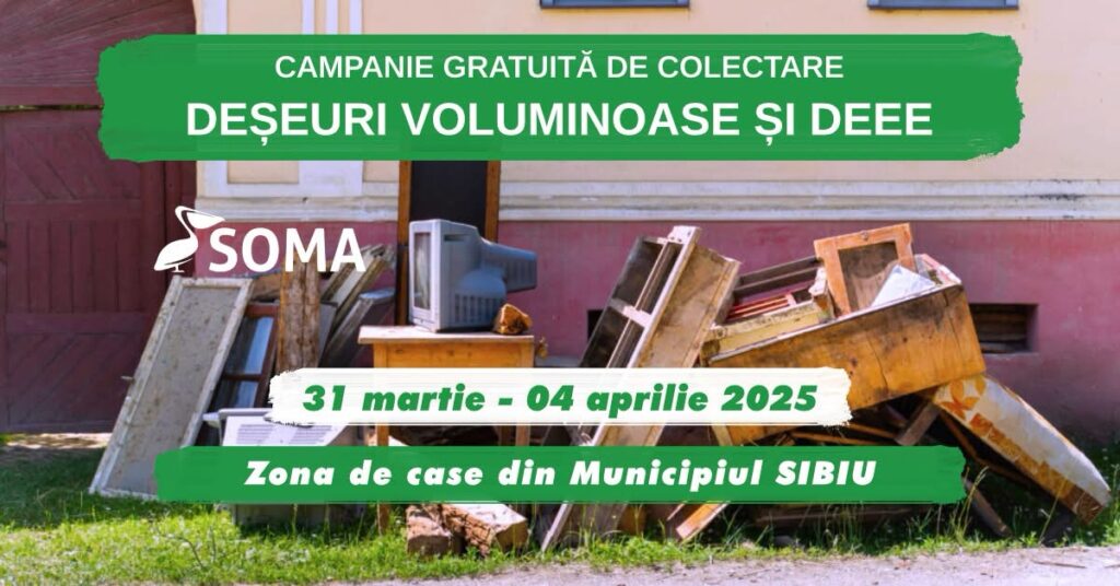 SC Soma SRL va organiza în municipiul Sibiu o nouă campanie de colectare a deșeurilor voluminoase, inclusiv deșeurile de echipamente electronice și electrice (DEEE). Campania se adresează strict locuitorilor din zonele de case din municipiu și se va derula între 31 martie și 4 aprilie 2025.
