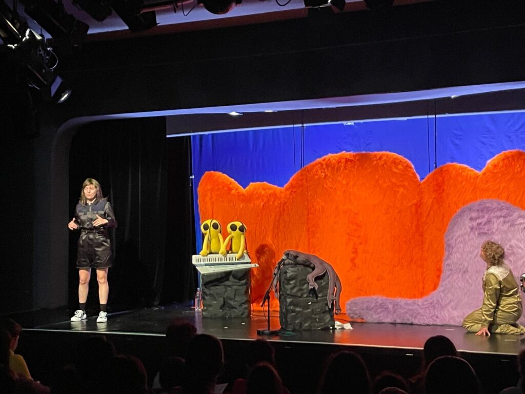 Evenimentul a început într-un mod neașteptat – o actriță îmbrăcată în melc și-a făcut apariția pe scenă, într-un decor în continuă transformare, unde un perete de blană părea să prindă viață. Pe un pian și-au făcut loc marionete galbene cu ochelari de soare, iar jocul luminii – care se aprindea și se stingea brusc – a creat o atmosferă misterioasă.
