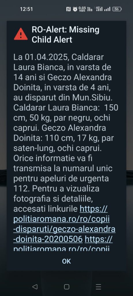 La data de 2 aprilie a.c., în jurul orei 02.00, polițiștii sibieni au fost sesizați de către o femeie cu privire la faptul că, la data de 1 aprilie a.c., în jurul orei 14.00, cele două fiice ale sale, GECZO ALEXANDRA DOINIȚA, în vârstă de 4 ani, și CĂLDĂRAR LAURA BIANCA, în vârstă de 14 ani, au plecat voluntar de la domiciliu, din municipiul Sibiu, jud. Sibiu, fără a mai reveni acasă.