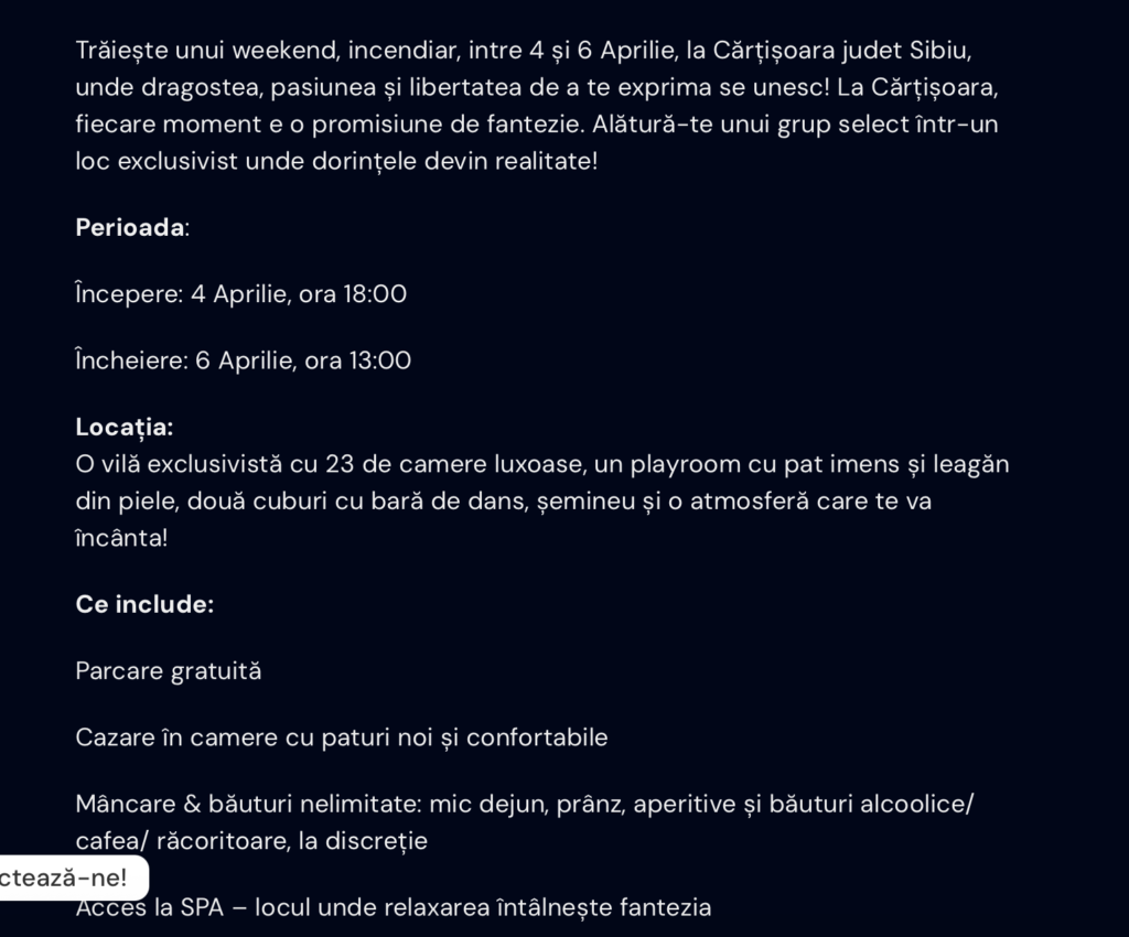Conform site-ului https://sensualparties.ro, petrecerea de swingeri a avut loc într-o vilă exclusivistă cu 23 de camere luxoase, dotată cu mai multe facilități: un playroom cu pat imens și leagăn din piele, două cuburi cu bară de dans, dar și un șemineu.