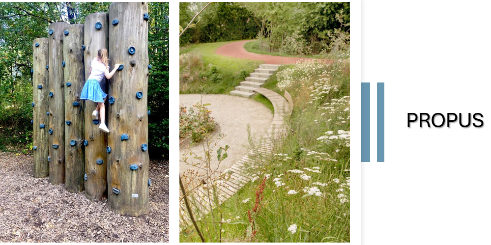 Mobilierul urban care va fi amplasat aici va fi confecționat din materiale ecologice. La fel și dotările pentru agrement din zona de fitness, workout și calistenics, cele din locul de joacă multifuncțional, dedicat copiilor cu vârste între 3 și 14 ani vor fi realizate din materiale potrivite zonei naturale. Tot pentru cei mici, se va crea un sistem de semnalistică interactivă-experimentală-educativă, iar dacă spațiul va permite, se va amenaja și un teren de volei pentru mișcare.