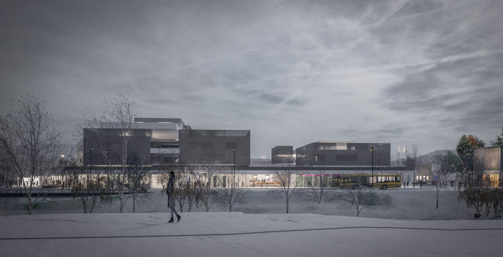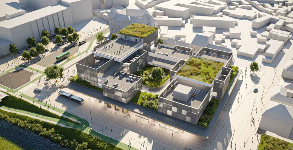- Crearea unui ansamblu de clădiri conectate, moderne și flexibile care să servească drept parcare cu aproximativ 350 de locuri și să înglobeze piața agroalimentară. Se are în vedere utilizarea unei arhitecturi modulare și adaptabile, integrată în contextul zonei.