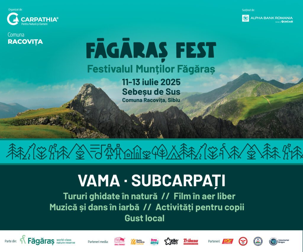 Făgăraș Fest revine în 2025 cu ediția a șasea, în pitorescul sat Sebeșu de Sus din comuna Racovița, județul Sibiu, în perioada 11-13 iulie. Cu o atmosferă vibrantă și activități pentru întreaga familie, festivalul va fi completat de concertele trupelor Subcarpați și Vama, care vor transforma weekendul într-unul plin de momente de neuitat. Festivalul, un manifest pentru protejarea valorilor naturale și culturale ale Munților Făgăraș, aduce în prim-plan atât natura, cât și comunitățile locale, și continuă să fie o platformă pentru promovarea naturii, ecoturismului, tradițiilor locale, educației pentru natură și a dezvoltării sustenabile a regiunii. Evenimentul este organizat de Fundația Conservation Carpathia și Primăria Racovița.