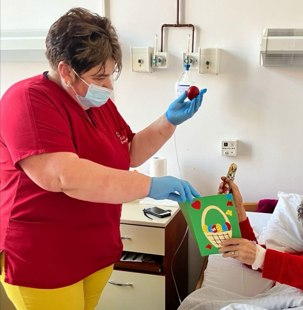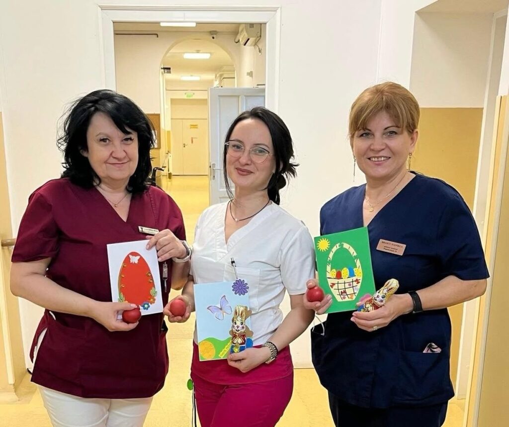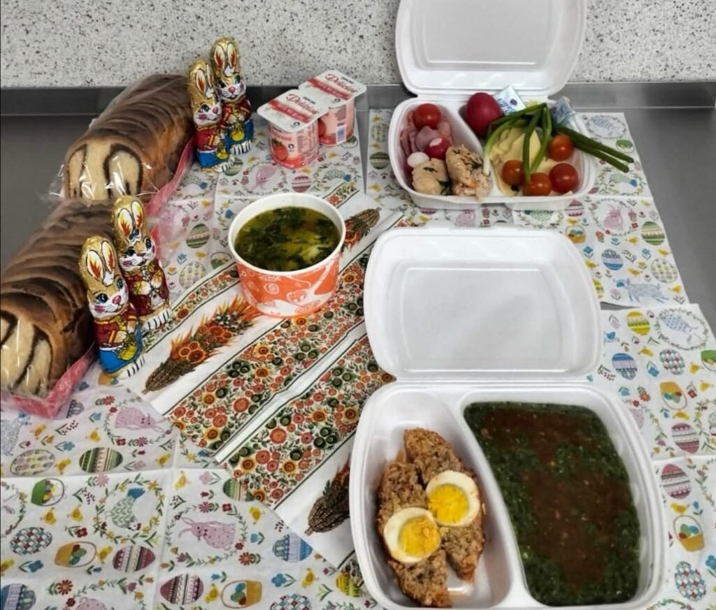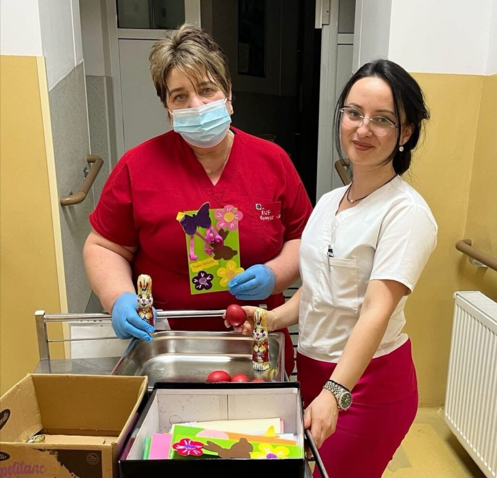 Atmosfera de sărbătoare a fost completată printr-un meniu festiv, din care nu au lipsit drobul, supa cu găluște, cozonacul cu nucă, ouăle roșii și iepurașii de ciocolată, astfel încât pe tot parcursul zilei pacienții să aibă parte de cât mai multe momente de bucurie.