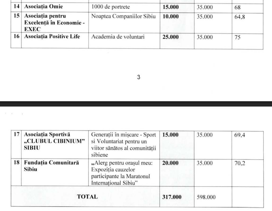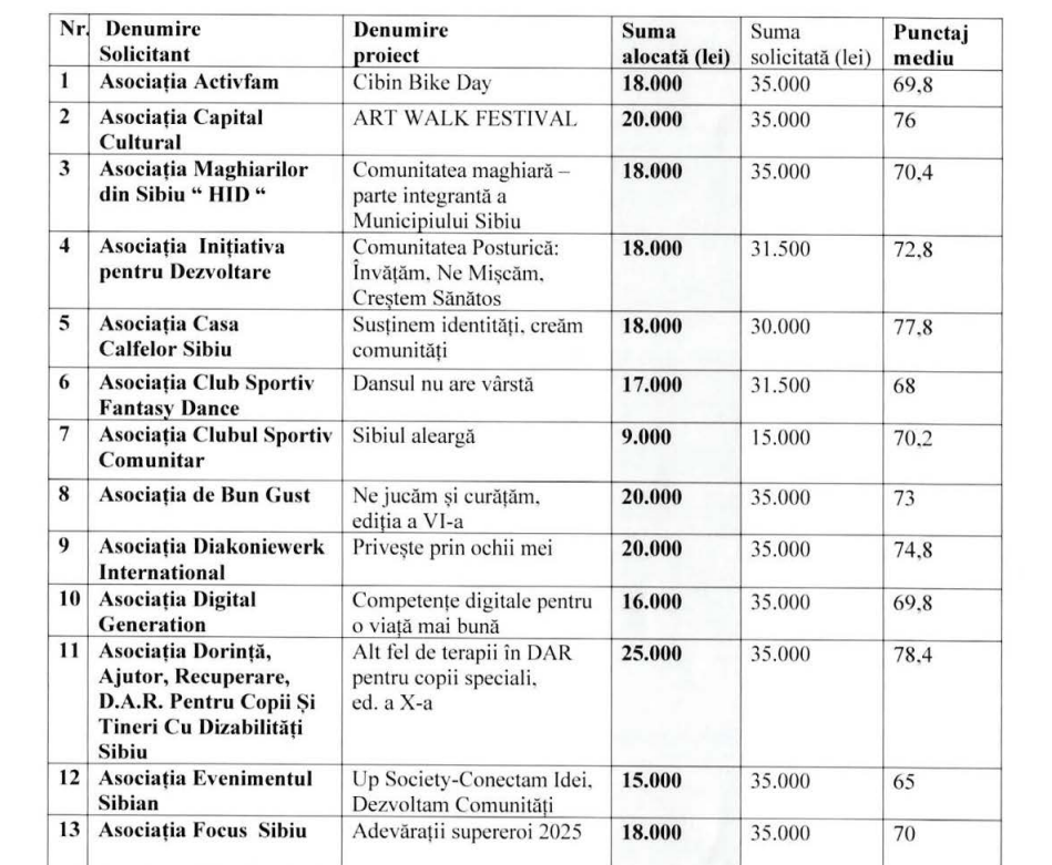 Aceasta va fi validată săptămâna viitoare de Consiliul Local. În total 18 proiecte vor primi finanțare, dar nu cât au cerut, ci sume mult mai mici. Din totalul de 598.000 de lei ceruți de asociații, Primăria Sibiu a aprobat să le aloce doar 317.000 de lei.