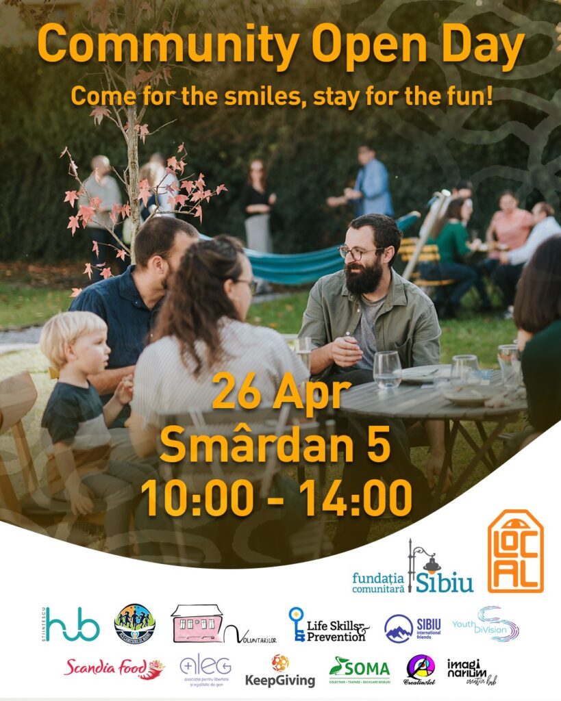 Fundația Comunitară Sibiu invită toți sibienii (noi și vechi) să participe la „Community Open Day”, un eveniment dedicat spiritului de comunitate și solidarității. Două programe îndrăgite ale Fundației Comunitare Sibiu – LOCAL (Linking Opportunities to Community based Assistance & Livelihoods) și Sibian/că – sunt aduse împreună, în cadrul acestui eveniment special, care va fi organizat sâmbătă, 26 aprilie, între orele 10:00 – 14:00, pe Str. Smârdan nr. 5, Sibiu (în curtea Ansamblului Bisericii Evanghelice Fortificate Guşteriţa) și în sala festivă din școala aflată în aceeași locație.