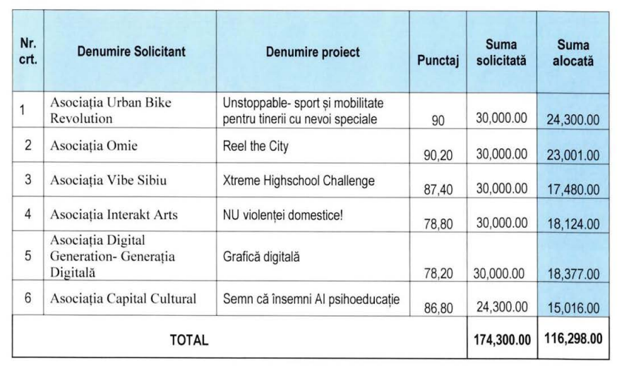 În total, Primăria Sibiu va aloca 116.298 de lei. Deși punctajele au fost mari la unele proiecte depuse, cei din Primăriei nu au alocat suma cerută la niciun proiect.