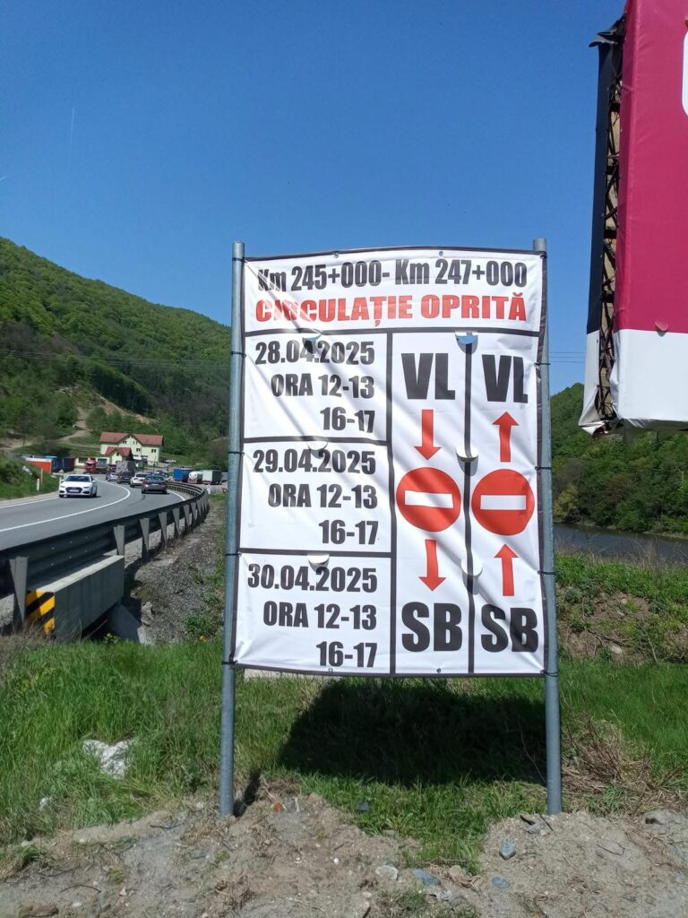 Circulația pe Valea Oltului (DN 7) va fi restricționată în zilele de luni, 28 aprilie 2025, și marți, 29 aprilie 2025, între orele 06:00 – 07:00, 12:00 – 13:00 și 16:00 – 17:00, pe tronsonul dintre localitățile Lazaret și Boița (km 245+500 – km 247+500), pentru pregătirea amplasamentului destinată lucrărilor la Autostrada Sibiu – Pitești, Secțiunea 2 Boița – Cornetu.