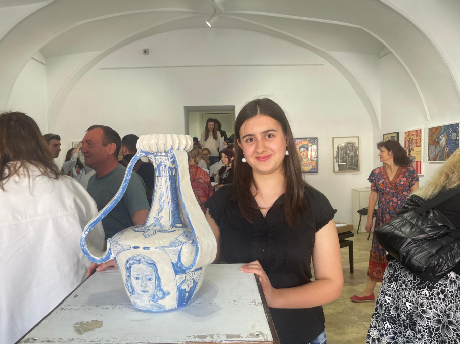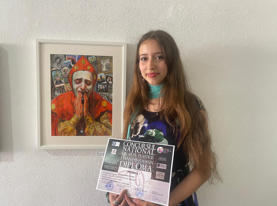 Diaconu Emma Cristina (Constanța): „Am câștigat premiul I la categoria arte decorative , iar experiența aici a fost foarte frumoasă, totul foarte bine organizat. Inspirația picturii mele a fost fotografia – amintiri din generații în generații. Portretul clownului semnifică durerea trecerii timpului.”