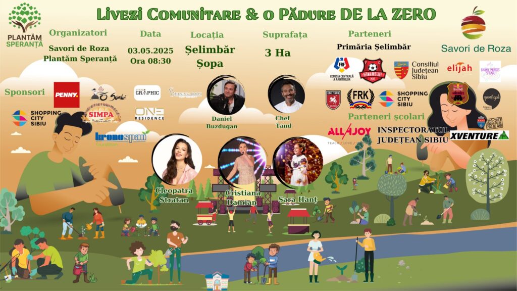 Sâmbătă, 3 mai 2025, începând cu ora 08:30, comunitatea din Șelimbăr și județul Sibiu este invitată să participe la un eveniment ecologic de amploare: „Livezi Comunitare & o Pădure DE LA ZERO”, organizat în zona Șopa. Această inițiativă face parte dintr-un proiect național desfășurat în perioada martie – mai 2025, care prevede plantarea a 200.000 de pomi fructiferi și 50.000 de arbori forestieri în șapte județe din România.