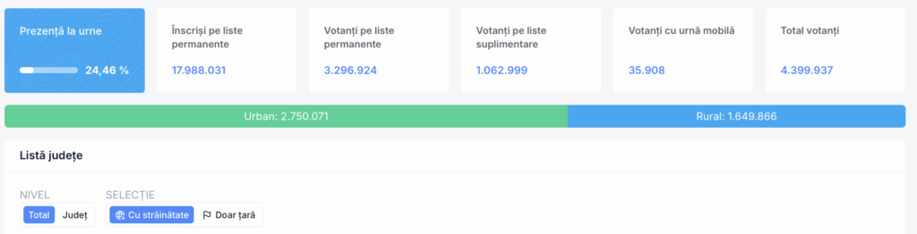 Până la ora 13:00, peste 4 milioane de români și-au exprimat opțiunea de vot. în ceea ce privește județul Sibiu, 63.662 de persoane și-au exprimat dreptul constituțional.