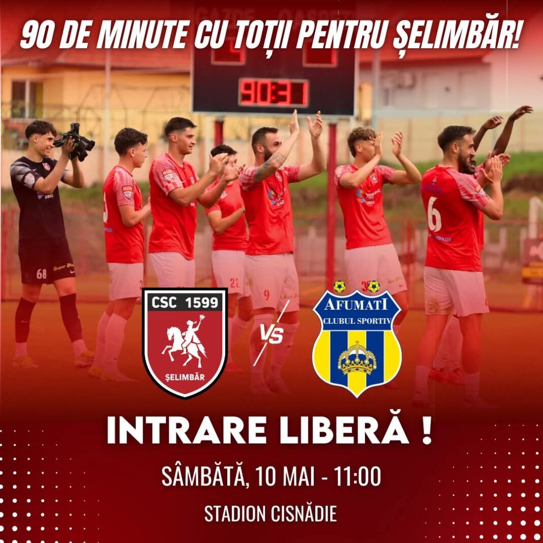 Partida CSC 1599 Șelimbăr – CS Afumați are loc pe Stadionul din Cisnădie, sâmbătă 10 mai 2025, de la ora 11.00. Oficialii clubuui sibian au decis ca intearea la meci să fie liberă. În cazul unui succes, CSC Șelimbăr va fi salvată de la retrogradare. În cazul unui egal sau a unei înfrângeri și a unei victorii a celor de la Chindia Târgovişte în partida cu CSM Slatina, sibienii vor merge la barajul de menținere în care vor întâlni CSC Dumbrăvița sau CSM Focșani.