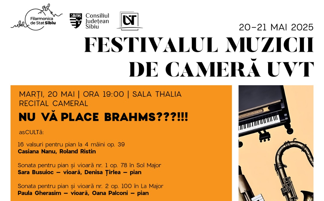 Festivalul Muzicii de Cameră UVT va avea loc la Filarmonica de Stat Sibiu, în Sala Thalia, marți și miercuri, 20 și 21 mai 2025, de la ora 19:00. Evenimentul aduce în fața publicului recitaluri camerale susținute de studenți ai Universității de Vest din Timișoara.