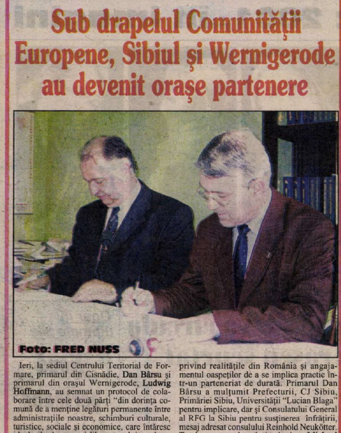 Ca o notă, înfrățirea între Cisnădie și Wernigerode s-a semnat în octombrie 2001, nu 2002, cum eronat a scris primarul german, necorectat de Orlățan. Dovada mai jos, extras din presa vremii, când primarul Cisnădiei de atunci, Dan Bârsu semna această înfrățire.