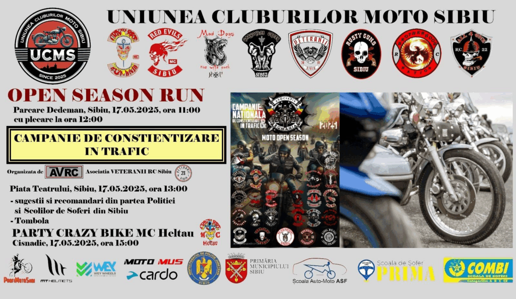 Vineri, 17 mai 2025, motocicliștii din Sibiu și din întreaga țară sunt invitați să participe la evenimentul „Open Season Run” și la cea de-a V-a ediție a campaniei de conștientizare în trafic organizate de Uniunea Cluburilor Moto Sibiu. Inițiativa este coordonată de Asociația Veteranii RC Sibiu, în colaborare cu alte opt cluburi moto din județ: Crazy Bike MC România, Red Evils MC Sibiu, Mad Dogs RC, Gargoyles Order RC Sibiu, Rusty Guns RC Sibiu, Brotherhood Nation RC, All 4 One RC Sibiu și Uniunea Cluburilor Moto Sibiu (UCMS).