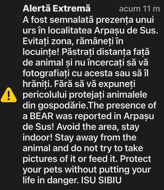 În urmă cu puțin timp, pe numărul unic pentru apeluri de urgență 112, a fost semnalată prezența unui urs în localitatea Arpașu de Sus.