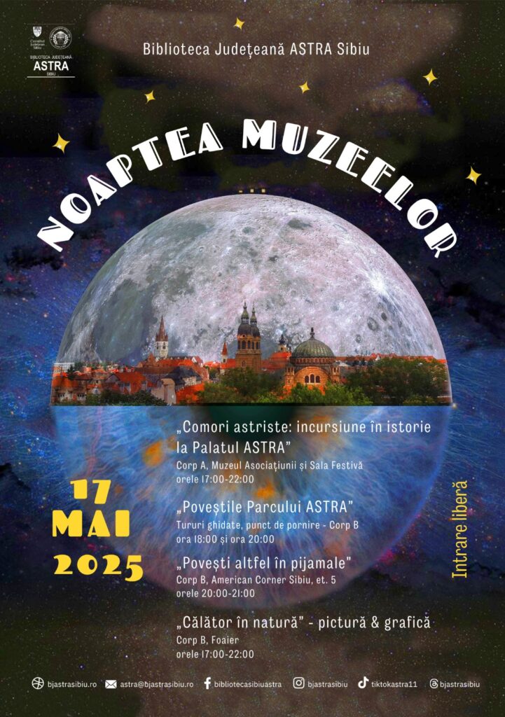 Biblioteca Județeană ASTRA Sibiu se alătură prietenilor de la Complexul Național Muzeal ASTRA și Muzeul Național Brukenthal, sărbătorind Noaptea Muzeelor 2025, sâmbătă, 17 mai 2025. Publicul este invitat la o seară de povești, istorie și explorare culturală. Vizitatorii de toate vârstele vor avea ocazia să participe la un program special, gândit pentru a aduce magia lecturii și farmecul trecutului mai aproape de comunitate. Participarea este gratuită la toate evenimentele desfășurate la Biblioteca ASTRA Sibiu, instituție care beneficiază de susținerea financiară a Consiliului Județean Sibiu.