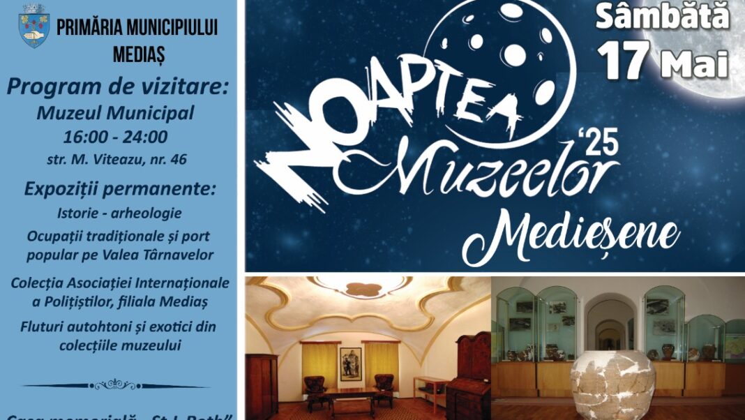 Primăria Municipiului Mediaș, prin Direcția pentru Cultură, organizează în data de 17 mai 2025, evenimentul anual care marchează Ziua Internaţională a Muzeelor, desfășurată pe plan local sub egida „Noaptea Muzeelor Medieșene”, o celebrare culturală a tuturor instituțiilor din acest domeniu.