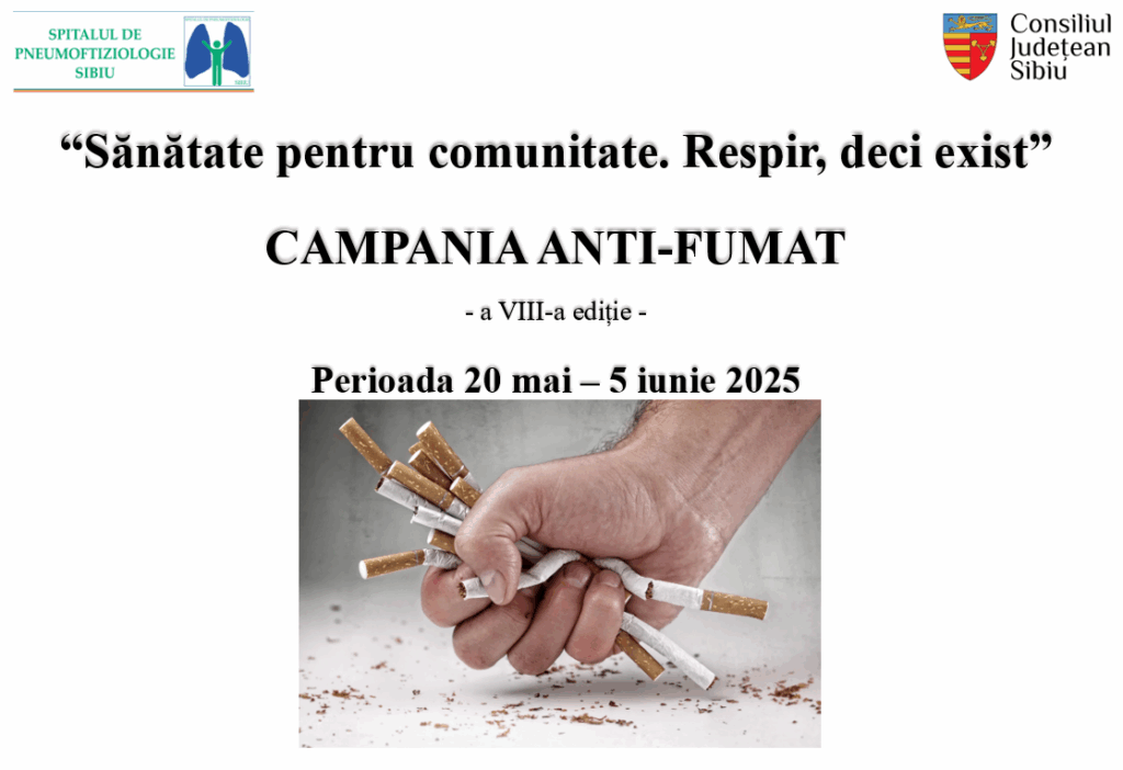 Spitalul de Pneumoftiziologie Sibiu va demara o nouă ediție a Campaniei Antifumat, tema din anul 2025 fiind „Sănătate pentru comunitate. Respir, deci exist”.