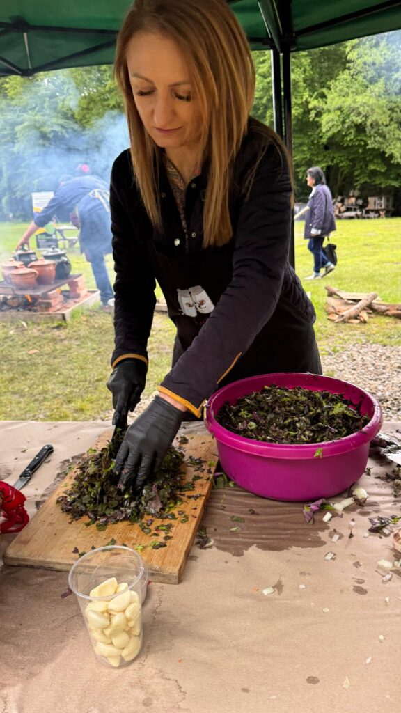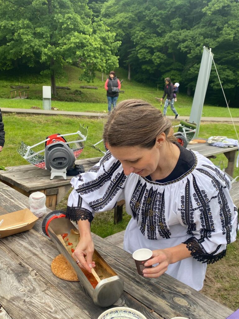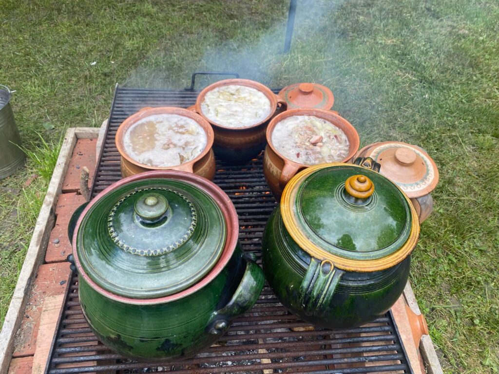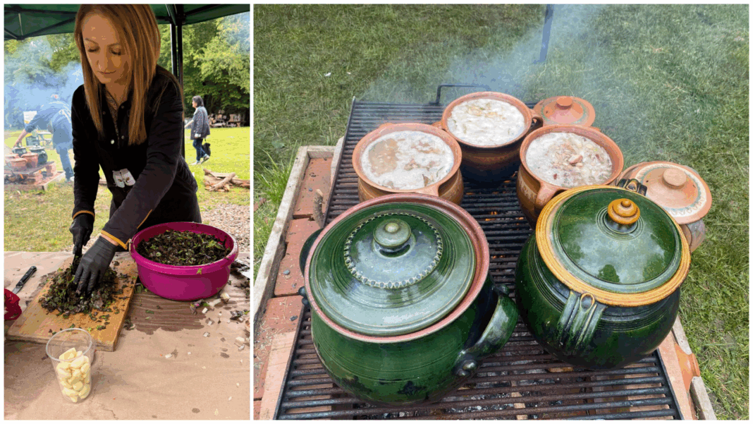Alături de ea, în bucătăria în aer liber, au gătit și directorul Muzeului ASTRA, Ciprian Ștefan, interpretul de muzică populară Robert Târnăveanu și mai mulți membri ai ansamblului Junii Sibiului, care au pregătit bulz și alte preparate delicioase, ca pe vremuri.