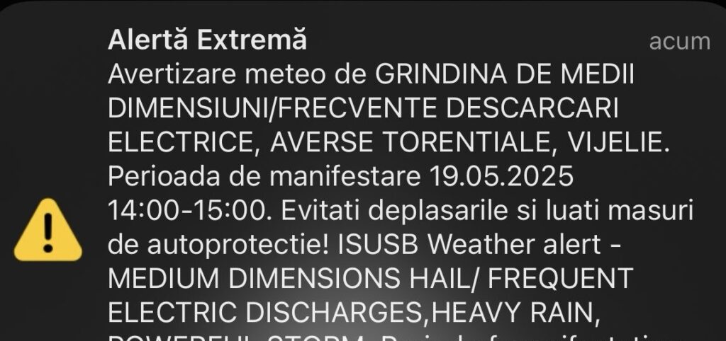 Administrația Națională de Meteorologie a emis o avertizare de cod portocaliu valabilă astăzi, 19 mai, în intervalul orar 14:00-15:00.