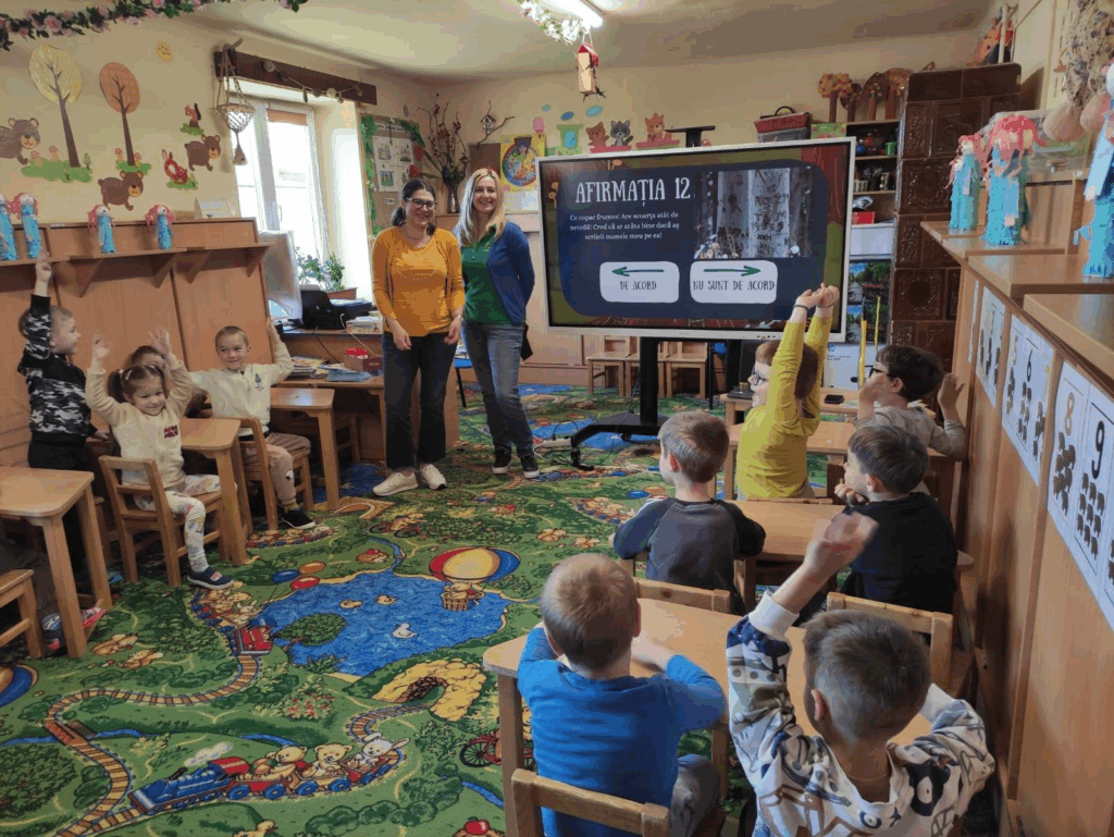 Copiii i-au întâmpinat pe vizitatori cu entuziasm și creații proprii din materiale reciclabile, precum „Mărie Hârtie” – o figurină realizată din tuburi de carton, hârtie creponată și alte materiale refolosite. Activitatea a inclus proiecții video educative și discuții interactive despre importanța colectării selective.