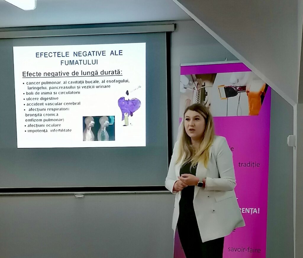 Micii artiști participanți la Olimpiada „Meșteșuguri artistice tradiționale”, provenind de la școlile din județul Sibiu, au avut parte astăzi de consiliere antifumat, oferită de doamna doctor Simina Mustățea, medic rezident pneumolog în cadrul Spitalului de Pneumoftiziologie Sibiu.